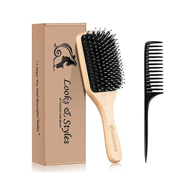 Hair Brush, Sosoon Boar Bristle Paddle Hairbrush for Long Short Thick Thin Curly Straight Wavy Dry Hair for Men Women Kids, No More Tangle, Giftbox & Tail Comb Included