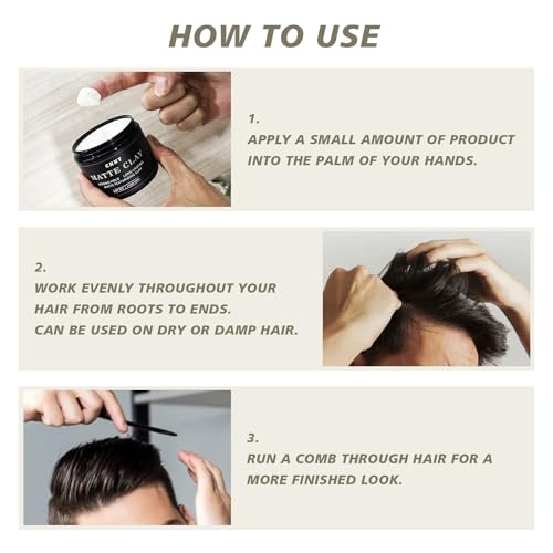 Application Tips: Apply Matte Clay to dry hair, depending on your desired style. It will be a bit low shine when it is first used, and then it will become matte after a while. For a more textured look, for a sleeker style. Gently massage into the hair using your fingers or a comb for better control and even distribution.