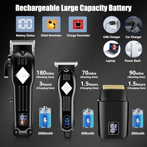 Smart Digital LCD Display & Long-Life Li-ion Battery : The ultra-clear LED can clearly show you the remaining charge, battery status and remind you to drip blade oil in time. Built-in 2000 mAh high capacity battery, charge for just three hours and get up to one hundred and eighty minutes of cordless use. This premium hair clipper set is great for travelling, holidays, business trips