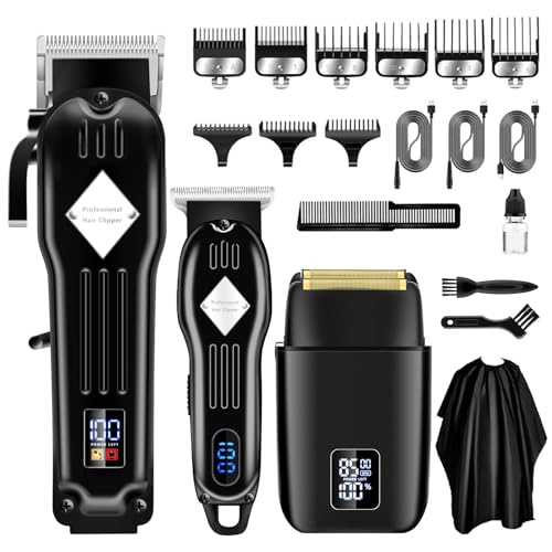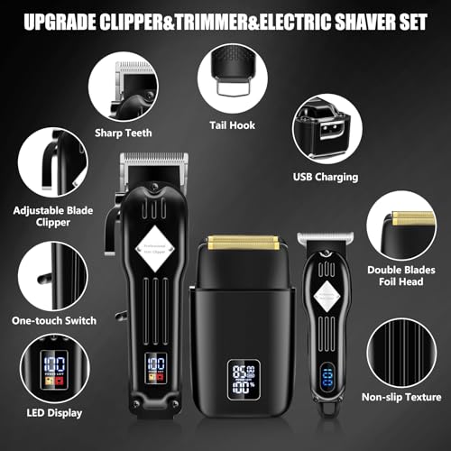 Professional Barber Clippers Set: This multifunctional hair clipper set combines the functions of clipper, detail trimmer and foil shaver in one. The large cordless clipper is fast and efficient, with an adjustable blade that easily cuts all hair types and lengths. The T-blade beard trimmer is perfect for precise trimming, grooming, sideburns, neck, beard lines and men’s shaving. The Bald Shaver works well on dense, short and thick hair and the ultra-thin blade mesh gives a close shave